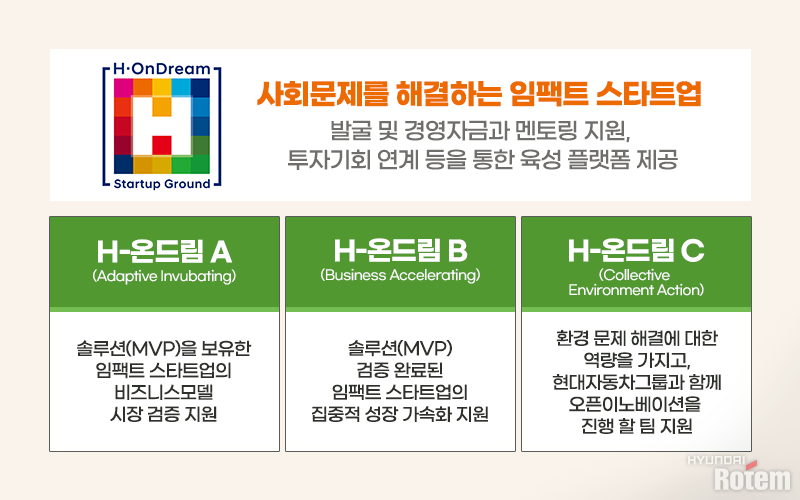 H-온드림은 효율적인 지원을 위해 참가 기업의 특성에 따라 3가지 세부 프로그램으로 나뉩니다. 참여 스타트업의 시장검증을 지원하는 ‘H-온드림 A(Adaptive Incubating)’와 집중적인 성장 가속화를 지원하는 ‘H-온드림 B(Business Accelerating)’ 그리고 환경 문제 해결에 기여하는 아이디어와 기술 역량 개발 및 실행을 지원하는 ‘H-온드림 C(Collective Environment Action)’가 있는데요. 그중, H-온드림 C는 현대차그룹과 현대차 정몽구 재단의 친환경 사회공헌에 대한 강한 의지가 담겨 있습니다. 이는 현대차그룹 전 계열사를 대상으로, 선발된 친환경 관련 스타트업과 함께 글로벌 기후 환경 개선을 목표로 프로젝트를 수행해나갈 수 있는 팀을 모집해 연결함으로써 실질적인 환경 가치 실천에 앞장서며 스타트업과 동반 성장을 도모합니다.