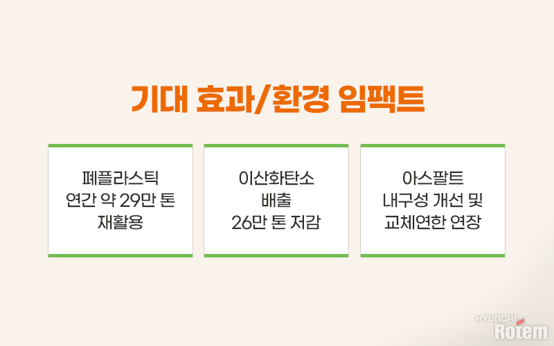 현대로템과 이옴텍의 친환경 아스팔트 소재 개발 프로젝트는 환경 문제 개선에 크게 기여할 것으로 기대됩니다. 먼저 연간 폐플라스틱의 약 29만 톤 재활용과 이로 인한 26만 톤의 탄소 배출 저감이 예상됩니다. 또한 아스팔트의 내구성을 강화하여 교체연한을 연장하는 등 사회, 경제적으로 수천억 원에 달하는 이득을 남기며 환경적으로도 혁신적인 가치를 실현할 것입니다.