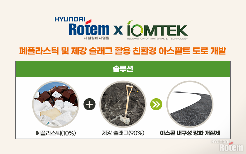 이옴텍과 현대로템은 폐플라스틱을 활용해 친환경 아스팔트 도로를 개발하고자 합니다. 제강 슬래그 입자를 폐플라스틱으로 코팅해, 아스팔트 도로 내구성을 강화하는 개질제 생산 기술을 착안했는데요. 이렇게 개발된 아스콘 내구성 강화 개질제는 기존의 화학 합성물을 사용한 개질제를 대체할 수 있습니다.