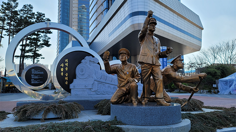 또한, 한국철도공사는 대전 본사 앞에 ‘기적을 울리는 사람들’ 조형물을 설치했는데요. 동상은 기관차의 기적을 울리는 김재현 기관사와 역 통과 허가증인 ‘통표’를 든 황남호 부기관사, 증기기관차 석탄 공급용 삽을 쥔 현재영 부기관사의 모습을 형상화했습니다. 그리고 한국전쟁 당시 전사한 철도영령 287인의 명단을 함께 새겨 철도인들의 희생을 기리고 넋을 추모합니다.