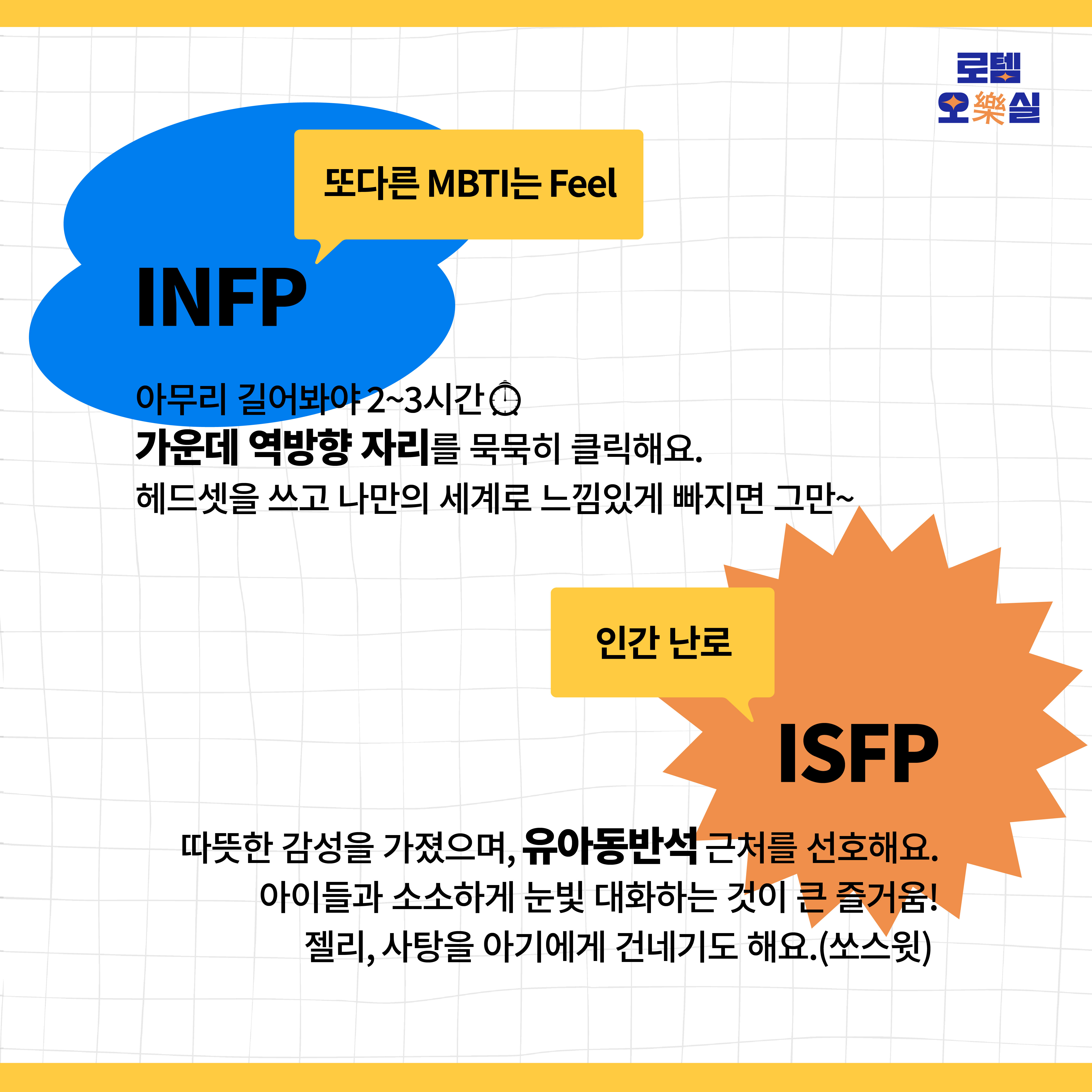 따뜻한 감성을 가진 ISFP는 많이들 피한다는 유아동반석 근처도 선호해요. 아이들과 소소하게 눈빛 대화하는 것이 ISFP에겐 큰 즐거움이예요. 우는 아이 때문에 곤란한 부모님들도 자청해서 돕고 젤리, 사탕을 아기에게 건네기도 해요.