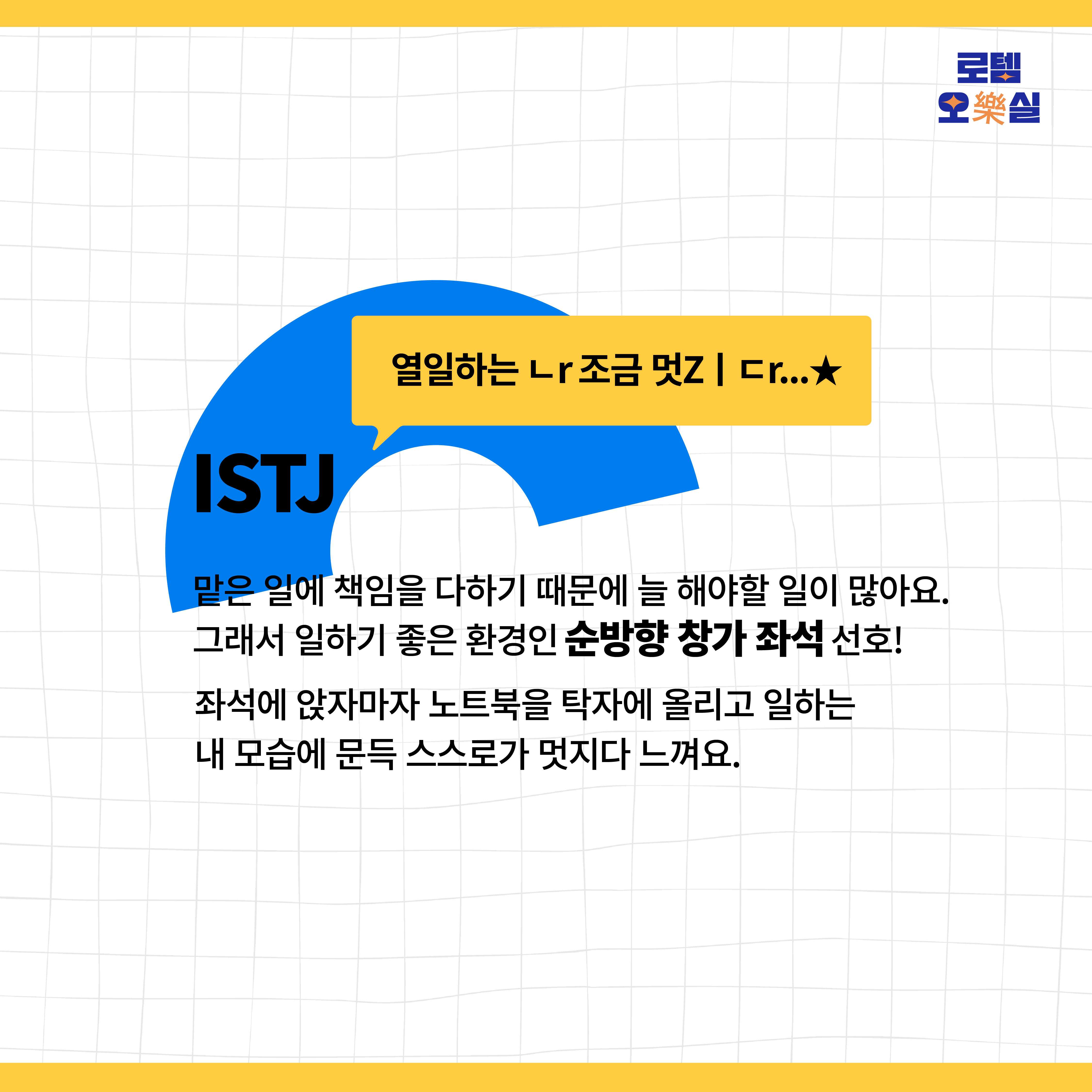 맡은 일에 책임을 다하는 ISTJ는 늘 해야 할 일이 많아요. 그래서 일하기 좋은 환경인 순방향 창가 좌석을 선호해요. 좌석에 앉자마자 탁자를 펼치고 노트북을 두고 업무를 보거나, 서류를 보고 있어요. 가끔 창밖을 보며 문득 일하는 본인에게 자부심을 느끼기도 해요.