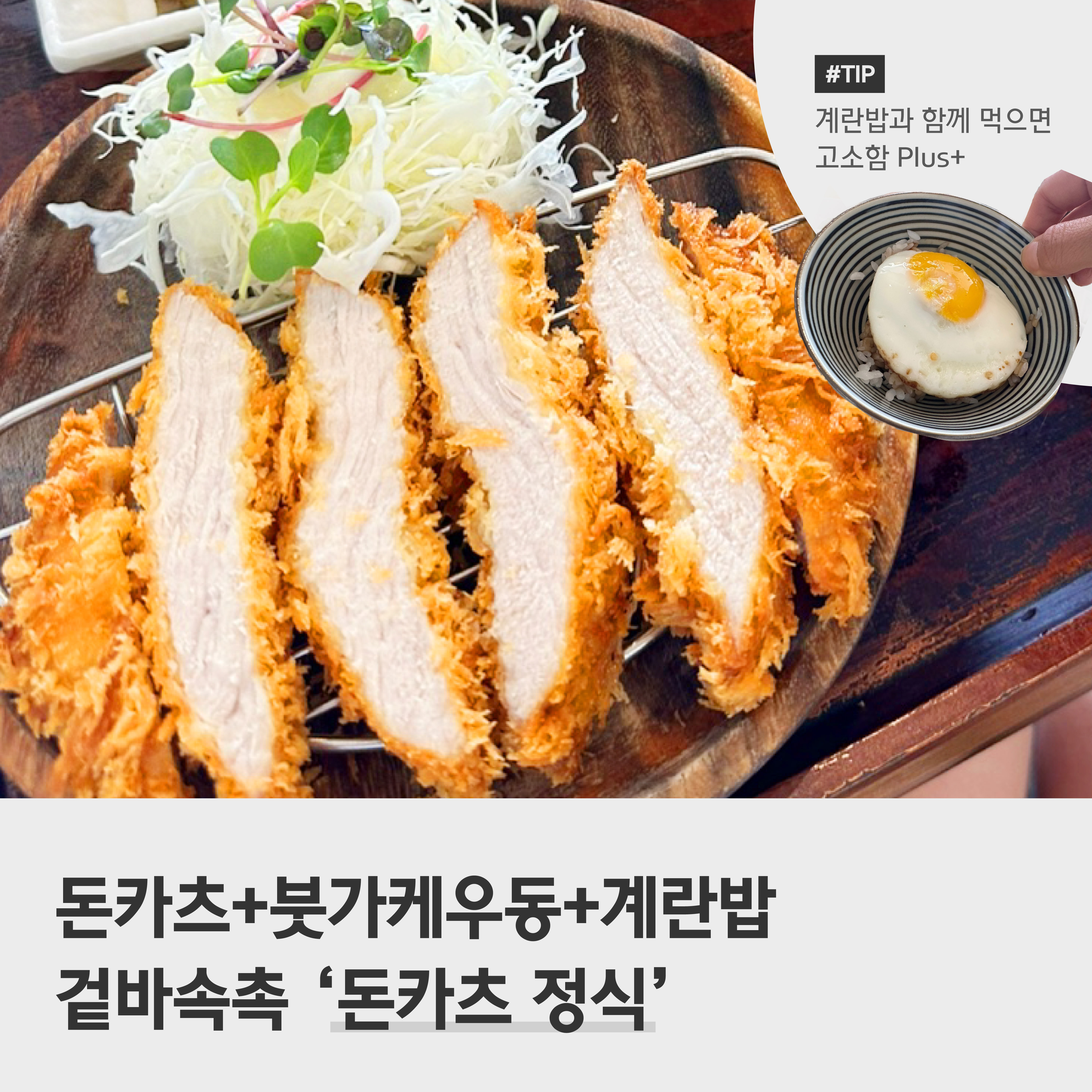 또 다른 대표 메뉴는 돈카츠, 붓가케우동, 계란밥으로 구성된 돈카츠 정식인데요. 돈카츠 세트의 가장 큰 장점은 가격 대비 음식의 양과 질이 정말 훌륭하다는 것입니다. 참고로 돈카츠 정식 A에는 냉우동 붓가케 우동이, B에는 온우동 가케우동이 나와요. 혼자먹기에 배가 부를 정도로 넉넉한 양이었습니다.