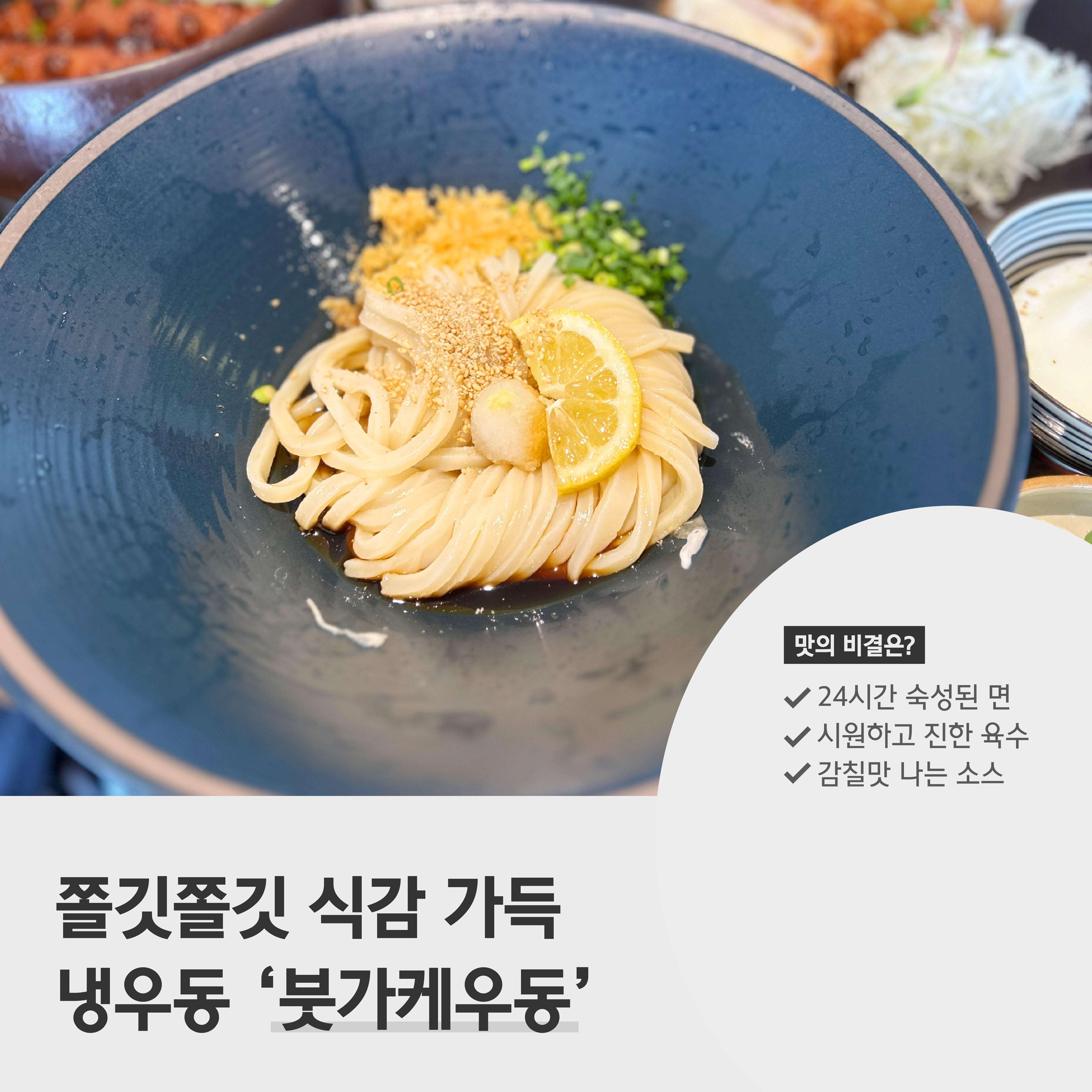 백운동의 시그니처 메뉴는 단연 붓가케우동이 아닐까 싶은데요. 붓가케우동은 식감이 살아있는 차가운 면에 특제 쯔유를 부어 먹는 우동인데요. 24시간 숙성된 면과 시원하고 진한 육수가 만나 잃었던 미각도 찾아주는 마성의 메뉴입니다. 시원하지만 너무 차갑지는 않아서 어르신과 아이도 맛나게 즐길 수 있어요.