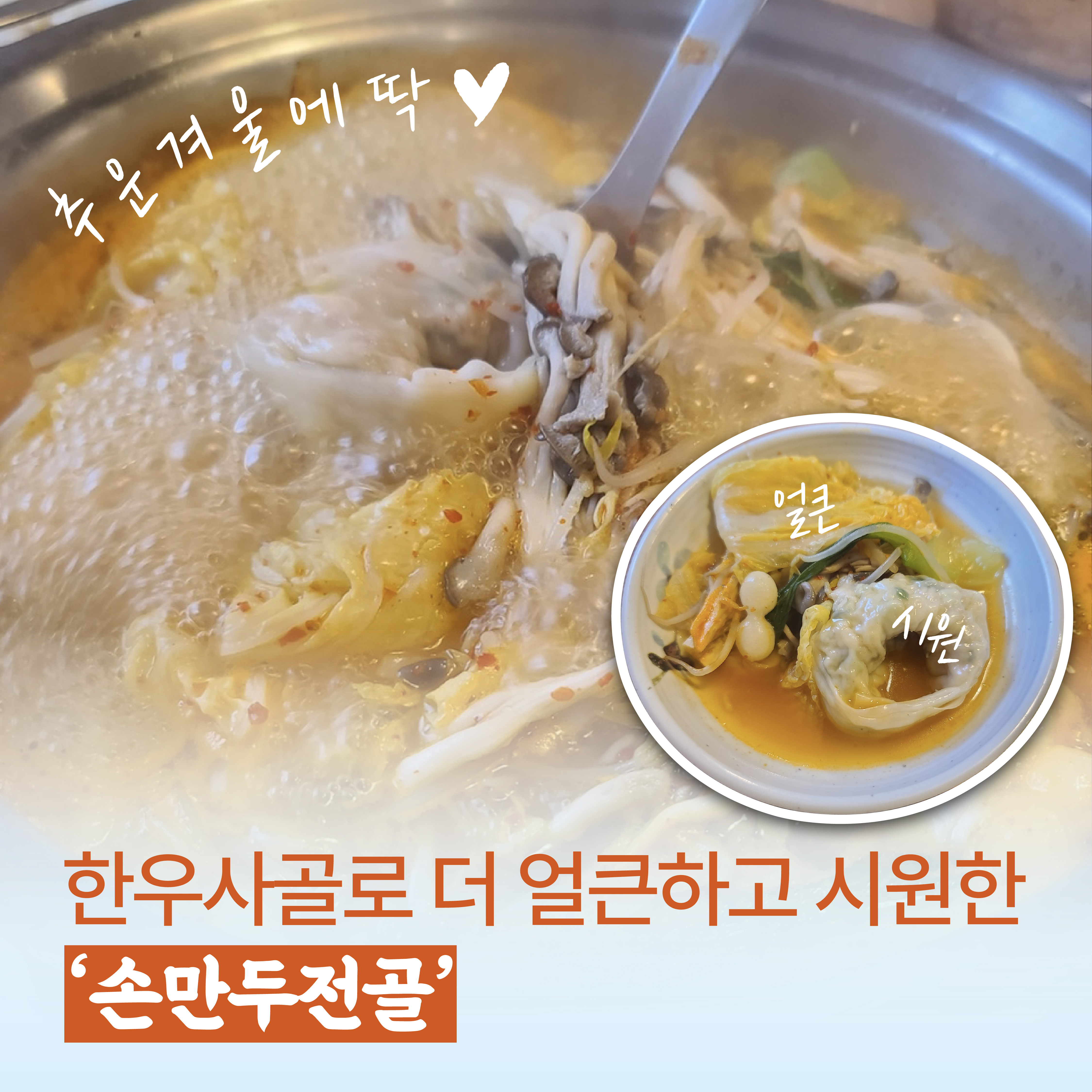 정원칼국수가 의왕맛집이 된 1등공신은 손만두전골인데요. 이 곳의 전골은 일반 전골과 다르게 만두를 따로 내어오고 칼국수도 곁들일 수 있는 것이 특징이에요. 얼큰하고 시원한 국물에 배추, 버섯, 숙주 등 야채가 푸짐해 겨울이면 특히나 많은 사랑을 받아요.